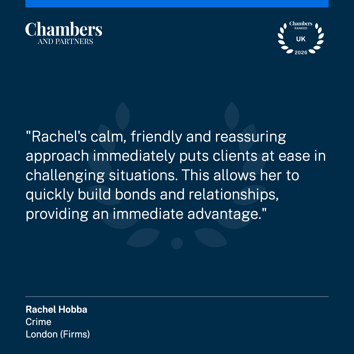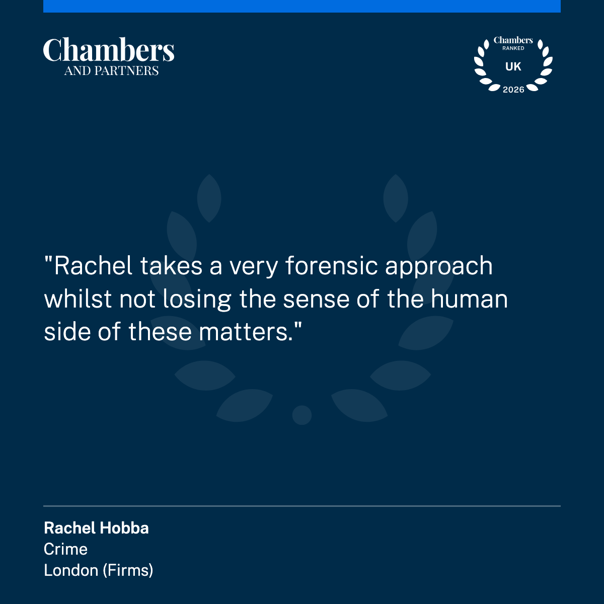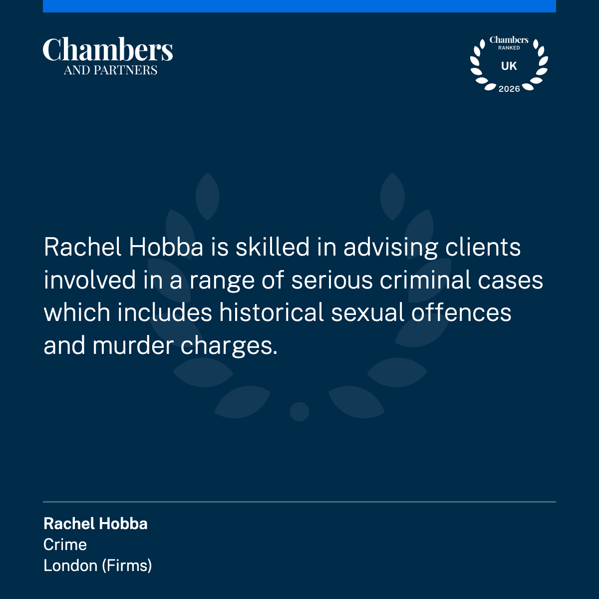 We are pleased to announce that Rachel Hobba has been newly ranked in Band 5 in the Chambers and Partners 2026 guide, recognising her expertise and longstanding contribution to criminal defence.